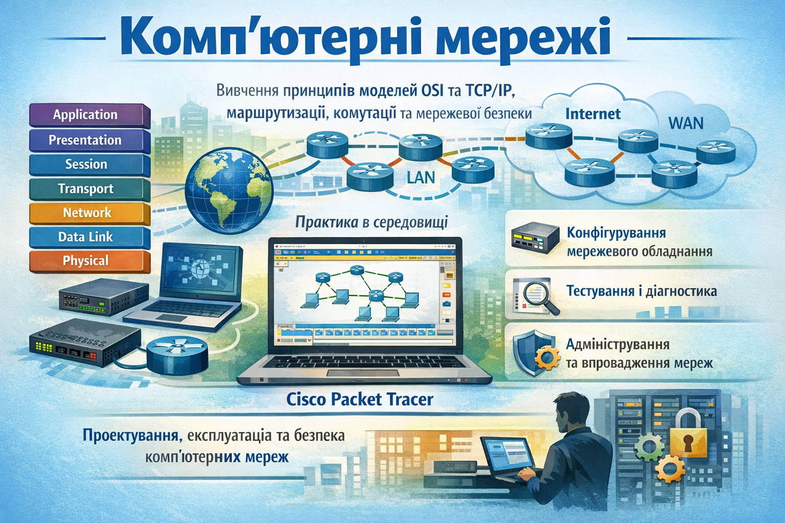 Дисципліна «Комп'ютерні мережі» охоплює теоретичні основи побудови локальних та глобальних мереж, моделі OSI і TCP/IP, протоколи передачі даних, маршрутизацію, комутацію та мережеву безпеку. Практична підготовка реалізується через Cisco Packet Tracer, що дозволяє оволодіти навичками конфігурування мережевого обладнання. Готує фахівців до розробки, впровадження та адміністрування сучасних комп'ютерних мереж.